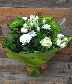 Our Eau Naturelle bouquets are made up of our best and freshest green and white flowers and will typically include roses, shamrocks, lisianthus, the green and white flowers of the season and greenery.