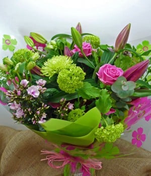 Our Pink Jade bouquets are made up of our best and freshest green and pink flowers and will typically include roses, lilies, verburnum, flox, the best green and white flowers of the season and greenery.