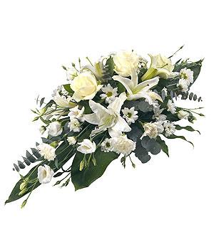 All our White Double Ended Sprays made up using our nicest white flowers which are at their best on the day of the funeral and will typically include roses, chrysanthemums, the best white flowers of the season and greenery.